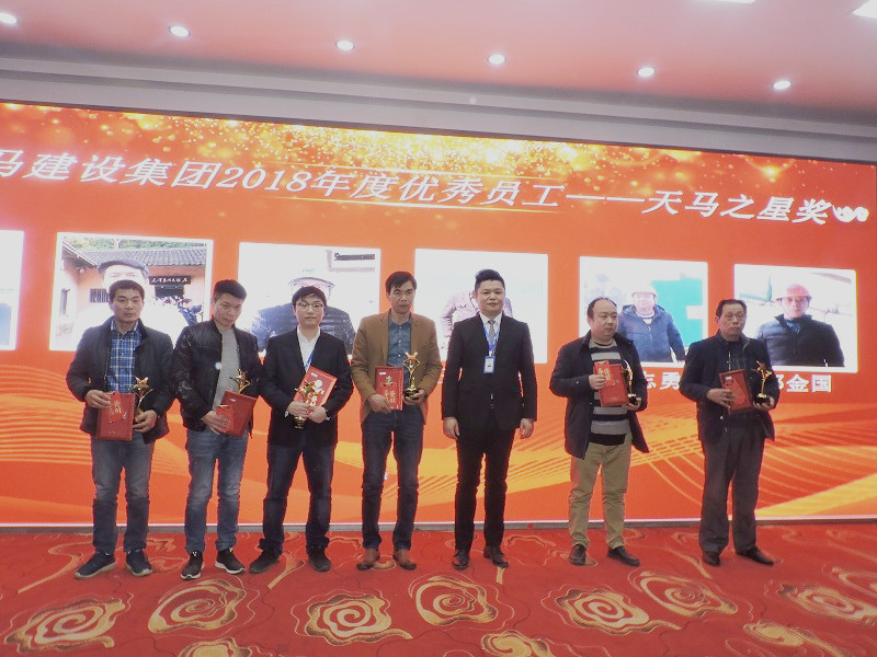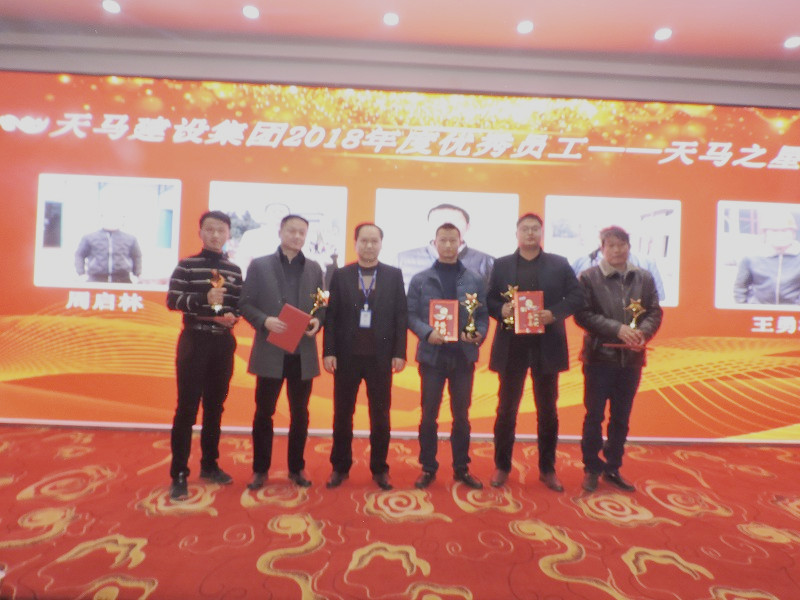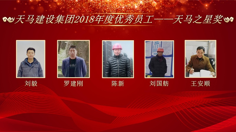2018年度優(yōu)秀員工——天馬之星獎”:“中石化項(xiàng)目” 施工員 劉 毅;“軍運(yùn)會立面整治”項(xiàng)目經(jīng)理 羅建剛;“嘉魚高地項(xiàng)目” 技術(shù)負(fù)責(zé)人 陳 新;“利川觀瀾國際 項(xiàng)目副經(jīng)理 劉國舫;“襄陽項(xiàng)目” 項(xiàng)目經(jīng)理 王安順