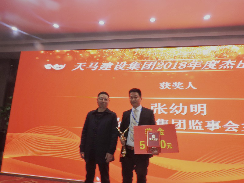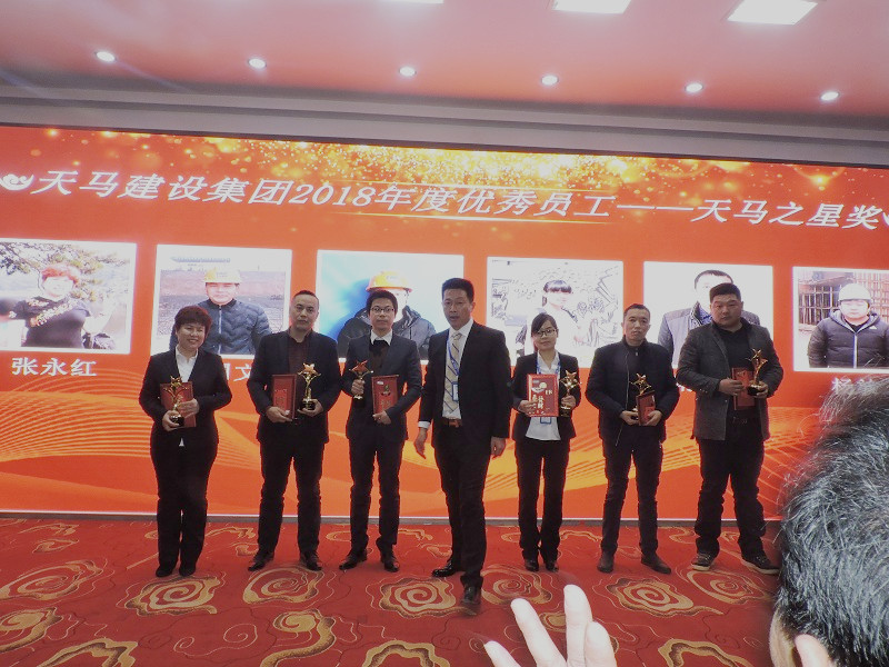 2018年度優(yōu)秀員工——天馬之星獎”:“天馬建設(shè)集團(tuán)”綜合部 張永紅;“經(jīng)開7#地塊” 施工員 操國文;“經(jīng)開9#地塊” 施工員 王 成;“天馬建設(shè)集團(tuán)” 財(cái)務(wù)部 何 歡;“武漢光谷電信項(xiàng)目” 生產(chǎn)經(jīng)理 靖雙紅;“五里界恒大項(xiàng)目”棟號長 楊放;頒獎人:集團(tuán)公司監(jiān)事會主席張幼明