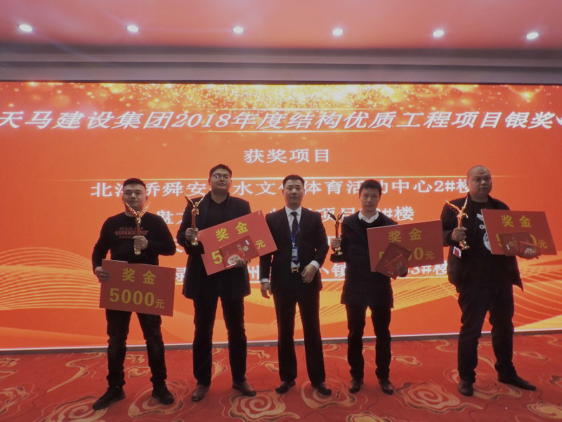 “2018年度/結(jié)構(gòu)優(yōu)質(zhì)工程項(xiàng)目銀獎”:“北洋橋舜安碧水文化體育活動中心2#樓”、“盤龍廣場·虹墅項(xiàng)目H2#樓”、“天地源工業(yè)標(biāo)準(zhǔn)廠房二期”、“漢南綠地歐洲風(fēng)情小鎮(zhèn)八區(qū)”;頒獎人:集團(tuán)公司工會主席李華彪