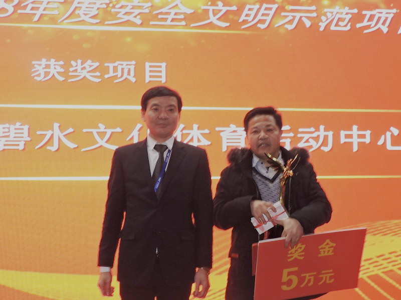 “2018年度安全文明示范項(xiàng)目金獎”:“北洋橋舜安碧水文化體育活動中心”;頒獎人:集團(tuán)黨委書記、董事長馮義橋